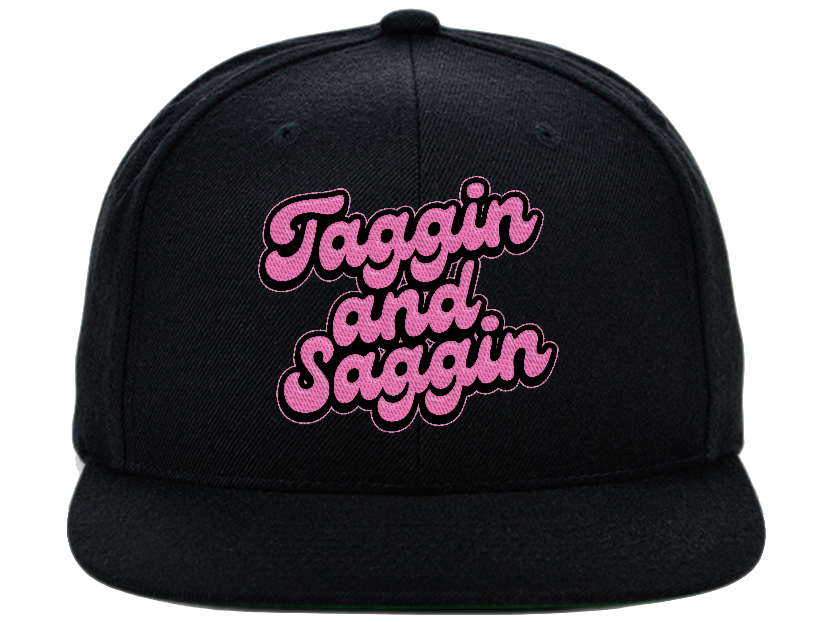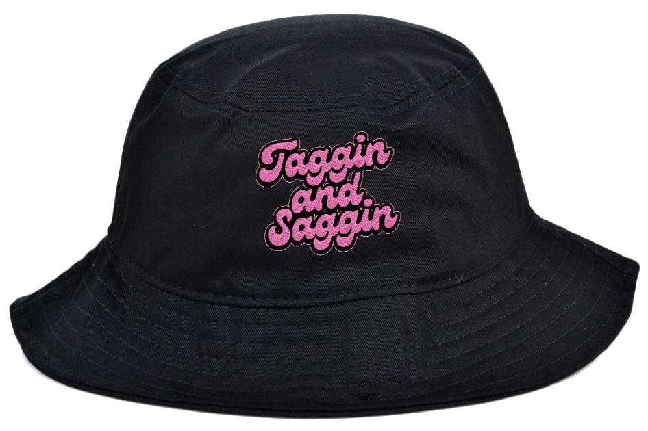 A comfy bucket hat with the Taggin and Saggin logo sewn over.